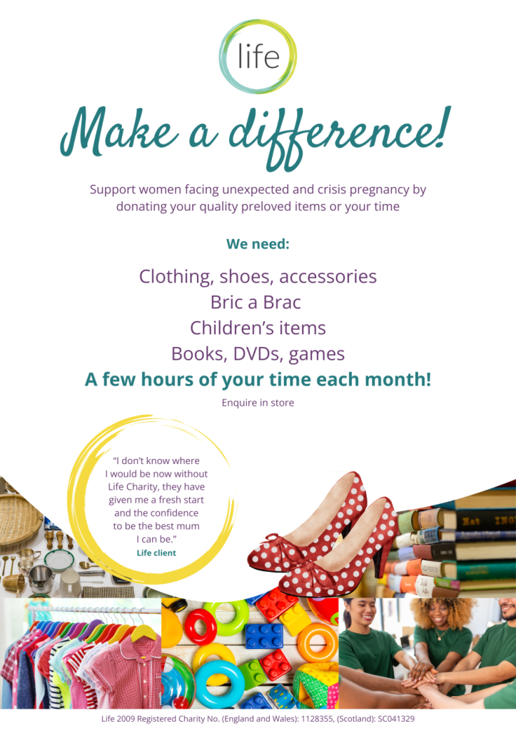 Support women and babies by donating your preloved items ready for local mums to buy, by shopping with us to raise money for our charity work or by volunteering to maximise our profits to support women and families facing unexpected or crisis pregnancies.